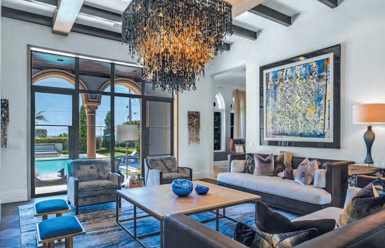 The living room is appointed with a beamed ceiling, a linear gas fireplace and a bank of French doors offering views of the pool and ocean.