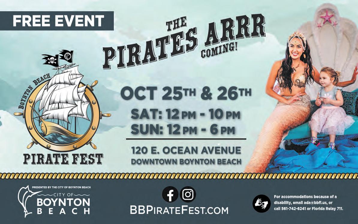 10/25-26 - Pirate Fest at Centennial Park Amphitheater, 120 E Ocean Ave., Boynton Beach. Entertainment, food, costumes, children’s activities, shopping, cannons, mermaids, pirates, more. Family fare. Sat: Noon-10 pm; Sun: Noon-6 pm. Free admission. 561-742-6000; bbpiratefest.com