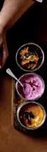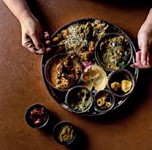 lunch with Asma’s childhood favourites, such as a Chilli Cheese Toastie starter (cheese, green chilli chutney, chopped onion and chilli) and Kosha Mangsho main (Bengali-style slow-cooked goat curry in a thick, clingy gravy). In the evening it’s a set Royal Thali, served on a copper platter and groaning with your choice of first and second katori (bowls), along with an array of sides and accompaniments including Aloo Mattar Sabzi (spiced potatoes and peas), puffed Indian bread, tamarind dal, beetroot raita, poppadom, chutneys, pickles and rice,
