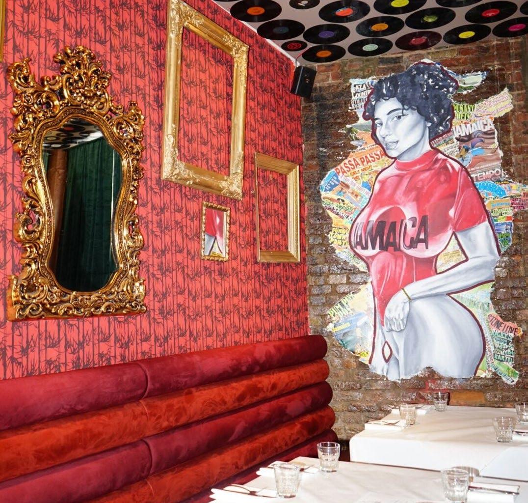As soon as diners are seated, they’re visually transported to Kingston, Jamaica, via Chelsea and Anthony Scott’s mural-scale art installations.