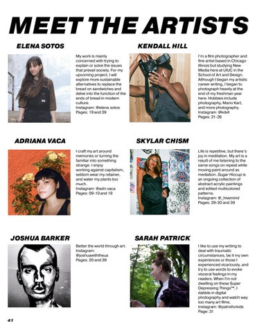 ELENA SOTOS My work is mainly concerned with trying to explain or solve the issues that prevail society. For my upcoming project, I will explore more sustainable alternatives to replace the bread on sandwiches and delve into the function of the ends of bread in modern culture. Instagram: @elena.sotos Pages: 19 and 39