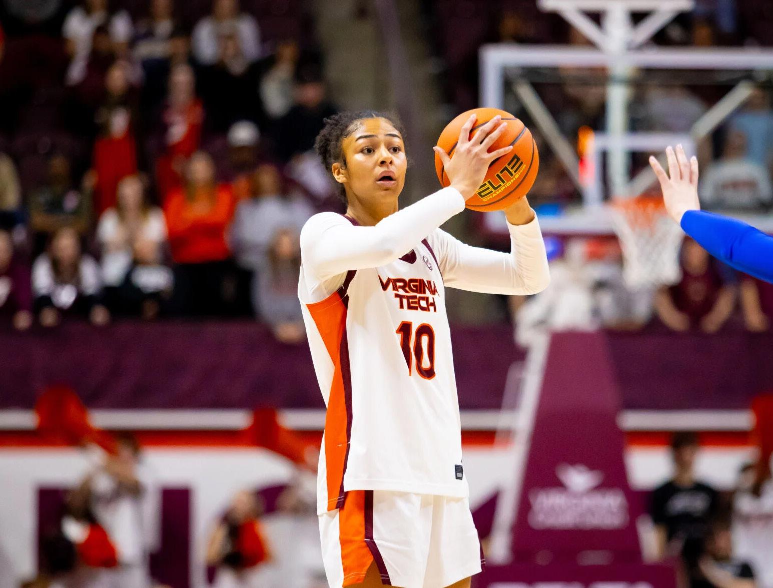 Virginia Tech Hokies forward Carys Baker (10) looks for an opening on Jan. 29, 2026, in Blacksburg, VA.