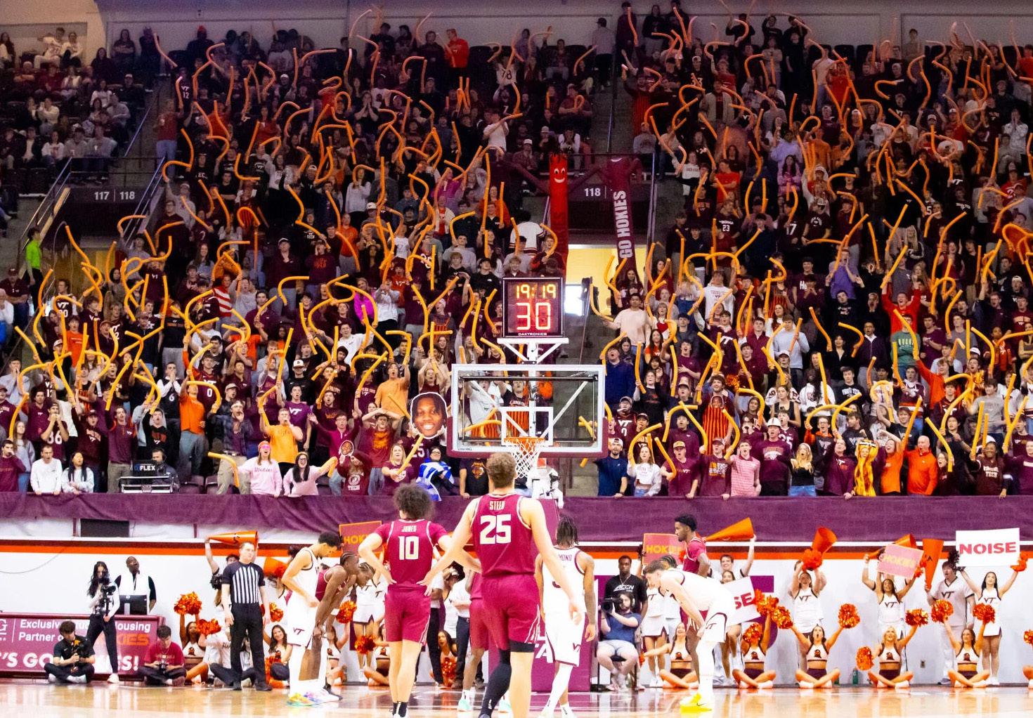 Virginia Tech Hokies men’s basketball fans wave orange pool noodles while FSU attempts a free throw in Cassell Coliseum on Feb. 14, 2026, in Blacksburg, VA.