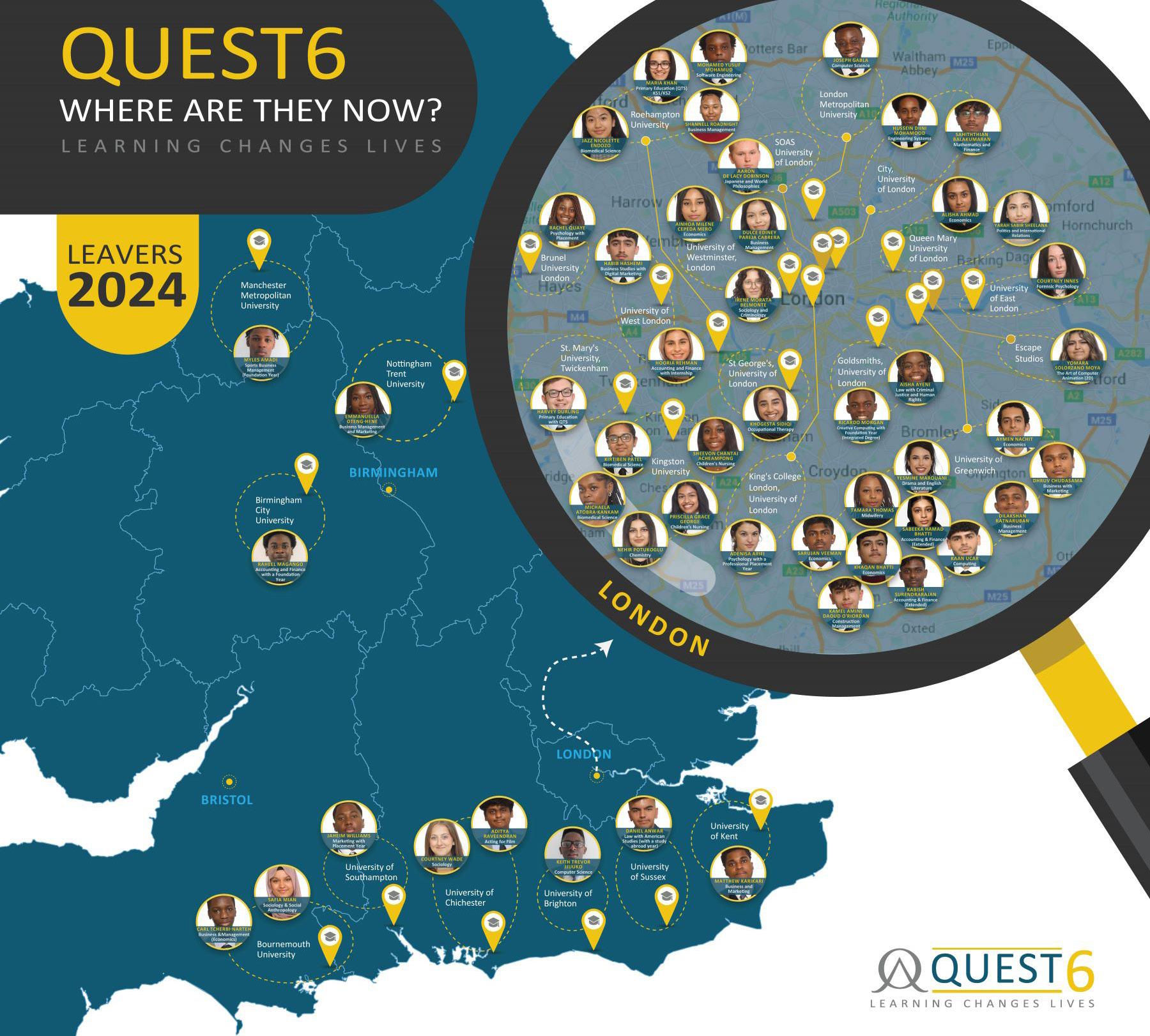 We are immensely proud of the destinations of all our students and in particular the large proportion that are accepted onto courses at prestigious Russell Group Universities. Students experience tailored careers guidance and support through Year 12 and are bombarded with great opportunities to get involved with to prepare themselves for life after Quest6.