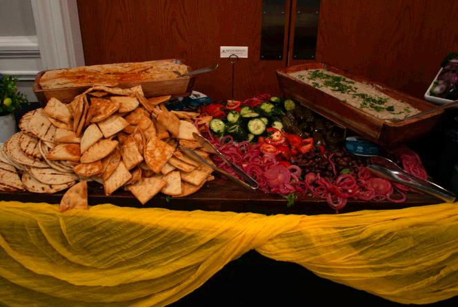pan-fried seitan cutlets with a lemon tahini sauce, Indian vegetable stir-fry and chana masala. At the Mediterranean Mezze Station was hummus, baba ganoush, fresh cucumbers, kalamata olives, and vegan pita chips .