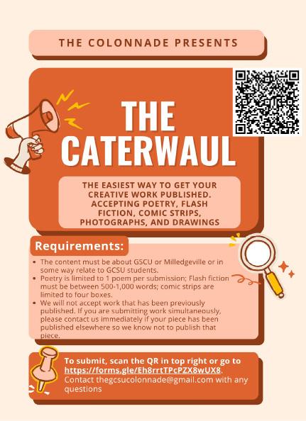 On behalf of The Colonnade staff we would like to present our newest submission column, “The Caterwaul.” This is an opportunity for students to share their poetry, flash fiction, photography, drawing, comic strips and more. We are extremely excited to give students more of a place in the paper and for their creativity to be acknowledged and published. We encourage any and all students to reach out and ask questions. In the spirit of GCSU’s mascot, Thunder, the name of this column takes inspiration from all that is a bobcat. Caterwauling is the noise bobcats make often, and that is what The Colonnade intends to do with this column: make noise with your voice.