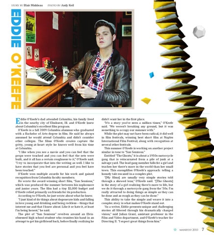 ddie O’Keefe’s dad attended Columbia; his family lived in the nearby city of Elmhurst, Ill. and O’Keefe knew about Columbia’s excellent film program. O’Keefe is a fall 2009 Columbia alumnus who graduated with a Bachelor of Arts degree in film. He said he always assumed he would attend Columbia and didn’t consider other colleges. The films O’Keefe creates capture the gritty, young-at-heart style he knows well from his time at Columbia. “I like when you see a movie and you can feel that the props were touched and you can feel that the sets were built, and it all has a certain roughness to it,” O’Keefe said. “I try to incorporate that into the writing as well. I like to have stories that you feel are personal and you feel have been touched.” O’Keefe won multiple awards for his work and gained recognition from Columbia faculty members. He wrote the award-winning short film, “Sun Sessions,” which was produced the summer between his sophomore and junior years. The film had a tiny $1,000 budget and O’Keefe relied primarily on friends for its production. According to O’Keefe, he just wrote about what he knew. “I just kind of do things about degenerate kids and falling in love young and drinking and being reckless—things that interest me and that I know about. Like it or hate it, at least I’m being honest,” he said. The plot of “Sun Sessions” revolves around an Elvisobsessed high school student who reunites his band in an attempt to get his girlfriend back, before finally realizing he