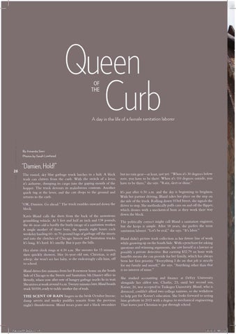 “Damien, Hold!” The rusted, sky blue garbage truck lurches to a halt. A black trash can clatters from the curb. With the switch of a lever, it’s airborne, dumping its cargo into the gaping mouth of the hopper. The truck devours its malodorous contents. Another quick tug at the lever, and the can drops to the ground and returns to the curb. “OK, Damien. Go ahead.” The truck rumbles onward down the block. Xavis Bland calls the shots from the back of the monstrous grumbling vehicle. At 5 feet and half an inch and 138 pounds, the 46-year-old is hardly the burly image of a sanitation worker. A single mother of three boys, she spends eight hours each weekday hauling 60- to 70-pound bags of garbage off the streets and into the clutches of Chicago Streets and Sanitation trucks. It’s long. It’s hard. It’s smelly. But it pays the bills. Her alarm clock rings at 4:30 a.m. She snoozes for 15 minutes, then quickly showers. Her 16-year-old son, Christian, is still asleep; she won’t see her baby, as she endearingly calls him, off to school. Bland drives five minutes from her Rosemoor home on the South Side of Chicago to the Streets and Sanitation 5th District office in Beverly, where row after row of hungry garbage trucks lie in wait. She arrives at work around 6 a.m. Twenty minutes later, Bland boards truck 510559, ready to tackle another day of trash. THE SCENT OF RAIN lingers in the brisk October breeze; damp streets and murky puddles remain from the previous night’s thunderstorm. Bland wears jeans and a black sweatshirt