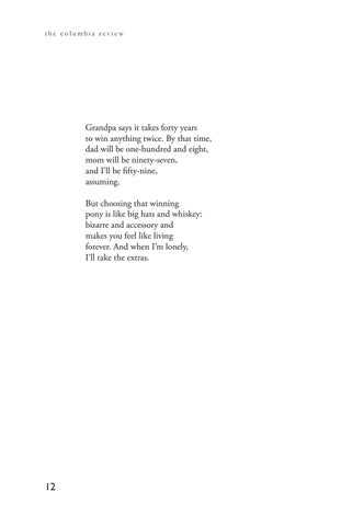 Grandpa says it takes forty years to win anything twice. By that time, dad will be one-hundred and eight, mom will be ninety-seven, and I’ll be fifty-nine, assuming. But choosing that winning pony is like big hats and whiskey: bizarre and accessory and makes you feel like living forever. And when I’m lonely, I’ll take the extras.
