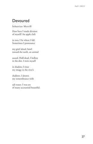 Sebastian Merrill ’s poetry has appeared in or is forthcoming from LEON Literary Review, Broadsided Press, wildness , and NonBinary Review . He has received support from the Bread Loaf Writers’ Conference, Friends of Writers, the Juniper Summer Writing Institute and the Academy of American Poets. He holds an MFA in Poetry from Warren Wilson College.