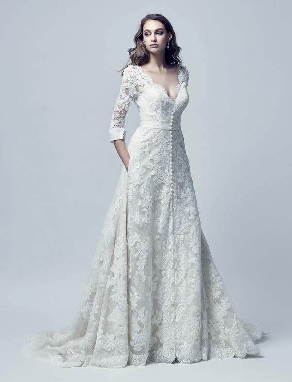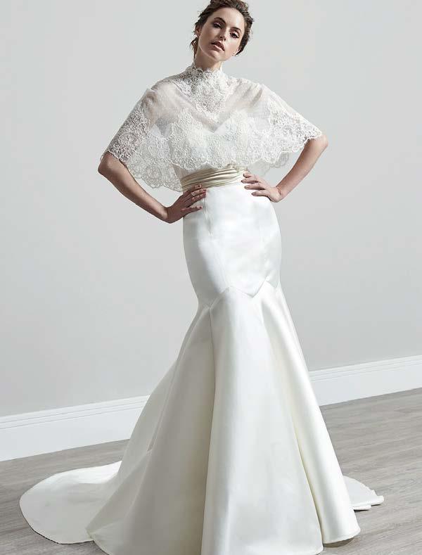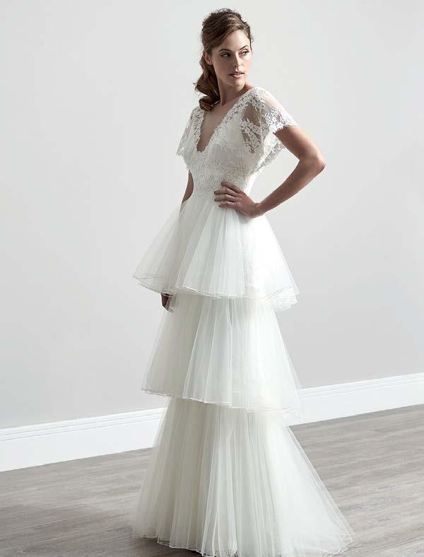 Show your natural flair with one of this season’s flower adorned gowns. This is a look for brides who want something with an edgy, boho vibe. Here the florals aren’t meant to shy away, they are gorgeous and textural – a beautiful contemporary detail. Dresses left to right: Halfpenny London, Willowby, David Fielden.