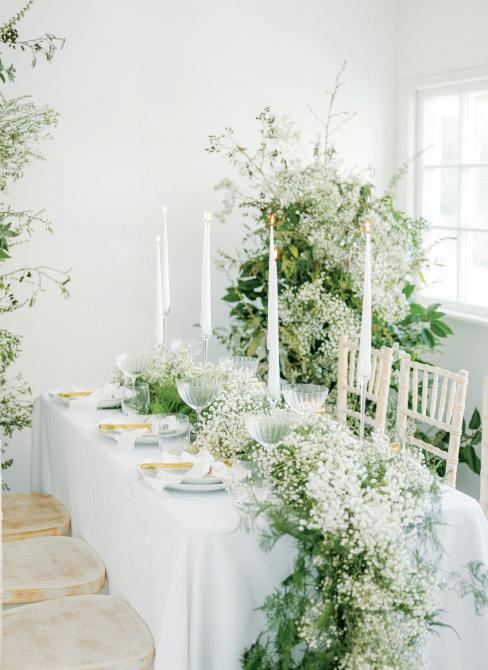 The setting is perfect for a relaxed and low-key affair. We love the use of colours found in nature; those Scandi vibes are effortlessly stylish, tying together a fresh forest feel with a pretty and modern aesthetic. “Focusing on a simple colour scheme, the cool palette of white and tonal greens was kept contemporary with gold accents that add warmth,” says Amie. “To lean into the Scandi inspiration, the look was created to reflect form and function with clean lines and chic yet simple finishing touches. The combination of flowing foliage, minimalist décor and delicate textures created an atmosphere that was light, and welcoming.”