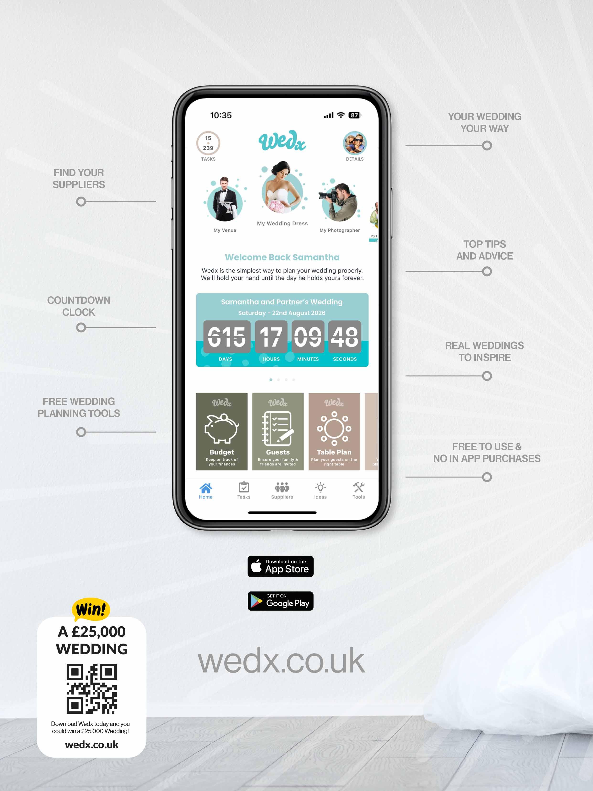 We’re also thrilled to introduce you to Wedx, our brandnew app, designed to simplify every step of your planning. Plus, don’t miss your chance to win a wedding worth up to £25,000—yes, really!