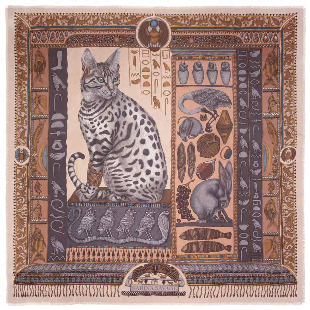 Illustrated in London and printed on silk twill in Como, Italy, the shawl measures 135cm x 135cm, with hieroglyphics that translate as an ode to Bastet — protector, huntress, and defender of the Sun god.