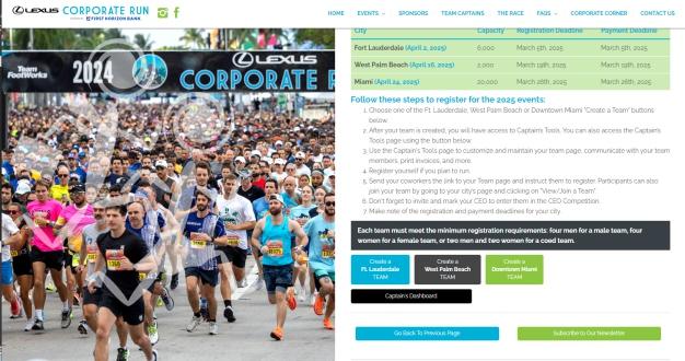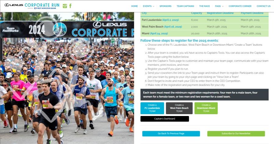 Register Your Company Today! Valuable manual and informational guide for the Team Captain on all the dates, deadlines, rules, tent rental and catering information for the 2025 Lexus Corporate Run. For more information, or to register your team go to: https://lexuscorporaterun.com/team_captains_central.php