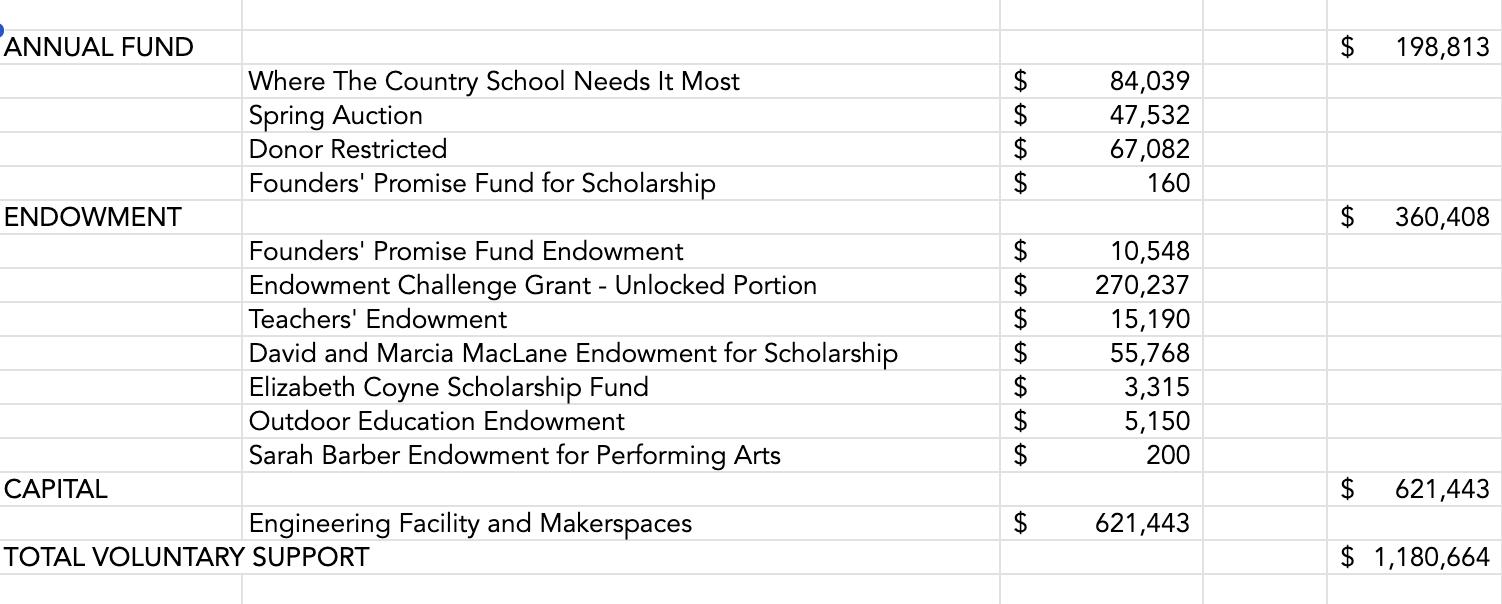 Annual giving for 2024-2025 to The Country School encompasses all monetary gifts received during the fiscal year beginning July 1, 2024, and ending June 30, 2025. Gifts include contributions to the Annual Fund, endowment, scholarships, restricted gifts, Class of 2025 Gift, capital, matching gifts, and fundraising events. We acknowledge and thank all our supporters for their generosity.