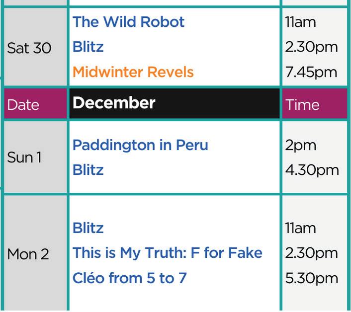 December Sun 1 4.30pm, Mon 2 11am, Tue 3 7.45pm, Wed 4 11am & 7.45pm