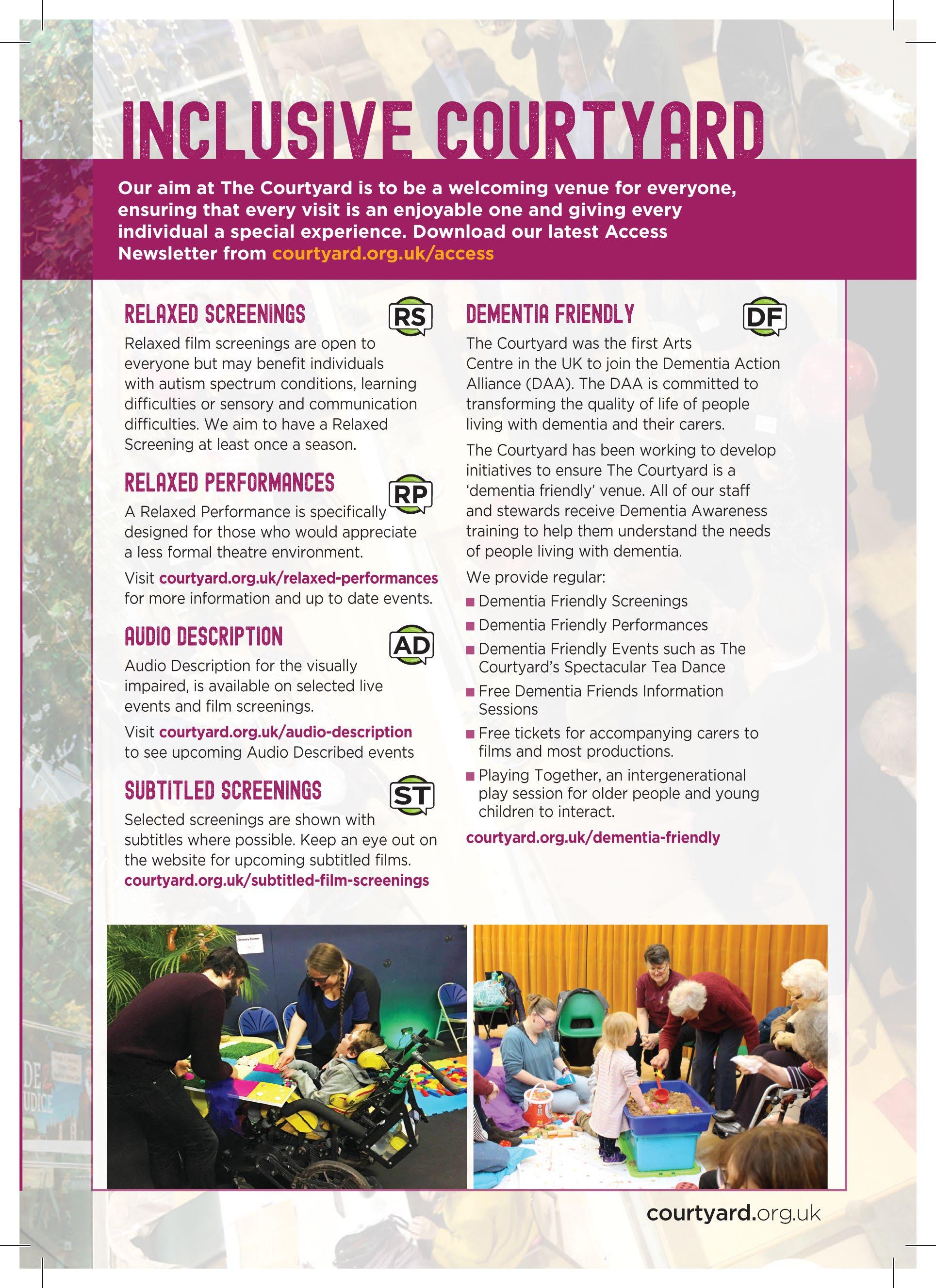 We offer bursaries for Youth Theatre sessions and selected holiday workshops. For more information contact: takepart@courtyard.org.uk