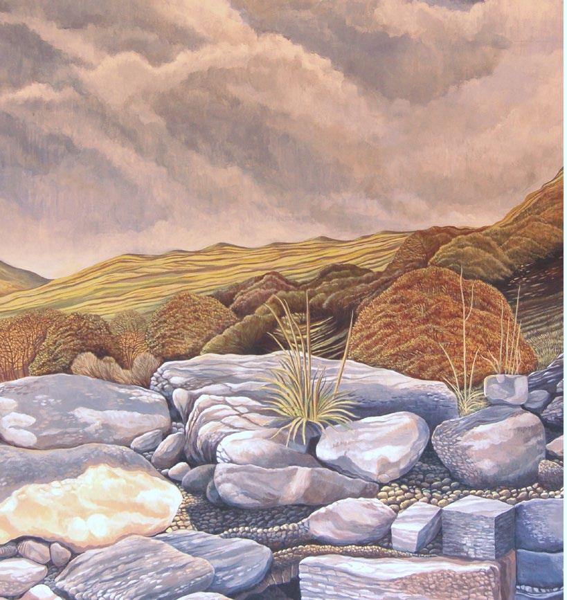 Philip Huckin has exhibited widely in English and Welsh galleries. Central to his work is the Ceredigion landscape, the mountains, hills and coastline, which are a constant source of inspiration. Here natural and man-made boundaries define the landscape: the field lines, trees, hedgerows and banks; the river valleys cutting and winding their way through the landscape; the boundary between the uplands and pastoral landscape below; and the farmsteads, settlements and ruins that point to Ceredigion’s deep historical and cultural past.