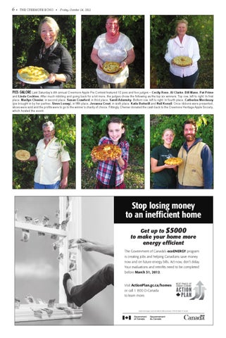 and Linda Cockton. After much nibbling and going back for a bit more, the judges chose the following as the top six winners. Top row, left to right: In first place, Marilyn Chenier; in second place, Susan Crawford; in third place, Sandi Adamsky. Bottom row, left to right: In fourth place, Catherine Morrissey (pie brought in by her partner, Steve Loewy); in fifth place, Jovanna Creet; in sixth place, Katie Butterill and Neil Koneil. Once ribbons were presented, slices were sold and the profits were to go to the winner’s charity of choice. Fittingly, Chenier donated the cash back to the Creemore Heritage Apple Society, which hosted the event.