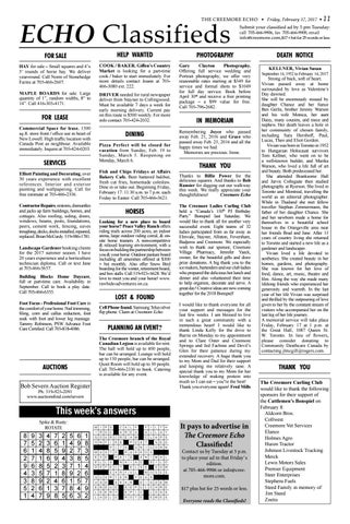 Submit your classified ad by 5 pm Tuesday: call 705-466-9906, fax 705-466-9908, email info@creemore.com,$17 + hst for 25 words or less