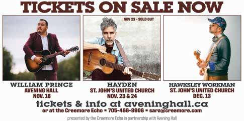 • An evening with Hayden at St. John's United Church. Enjoy an intimate show with this renowned yet reclusive Canadian music icon. Tickets $40 available at www.aveninghall.ca or at The Creemore Echo. ***Wednesday show SOLD OUT***