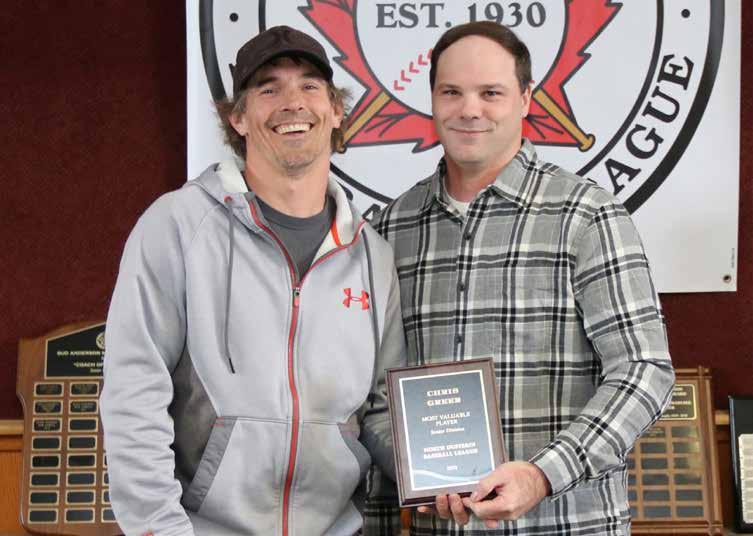 Chris Greer of the New Lowell Knights was named the most valuable player in the senior division of the North Dufferin Baseball League and receives his award from secretary Scott Anderson during an awards presentation on March 13. See page 8 for more winners.