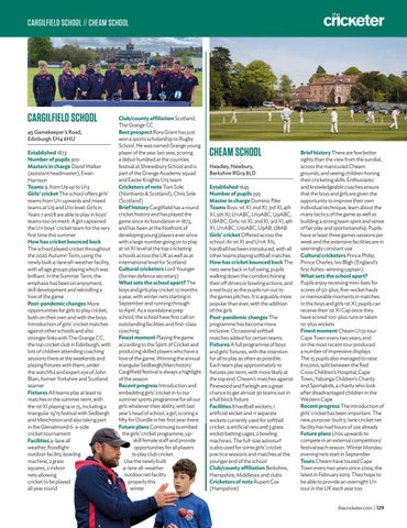 CARGILFIELD SCHOOL 45 Gamekeeper’s Road, Edinburgh EH4 6HU Established 1873 Number of pupils 300 Masters in charge David Walker (assistant headmaster), Ewan Harrison Teams 9, from U9 up to U13 Girls’ cricket The school offers girls’ teams from U11 upwards and mixed teams at U9 and U10 level. Girls in Years 7 and 8 are able to play in boys’ teams too on merit. A girl captained the U11 boys’ cricket team for the very first time this summer How has cricket bounced back The school played cricket throughout the 2020 Autumn Term, using the newly built 4-lane all-weather facility, with all age groups playing which was brilliant. In the Summer Term, the emphasis has been on enjoyment, skill development and rekindling a love of the game Post-pandemic changes More opportunities for girls to play cricket, both on their own and with the boys. Introduction of girls’ cricket matches against other schools and also stronger links with The Grange CC, the top cricket club in Edinburgh, with lots of children attending coaching sessions there at the weekends and playing fixtures with them, under the watchful and expert eye of John Blain, former Yorkshire and Scotland seamer Fixtures All teams play at least 10 matches in the summer term, with the 1st XI playing 14 or 15, including a triangular 15/15 festival with Sedbergh and Merchiston and also taking part in the Glenalmond 6-a-side cricket tournament Facilities 4-lane all weather, floodlight outdoor facility, bowling machine, 2 grass squares, 2 indoor nets allowing cricket to be played all year round