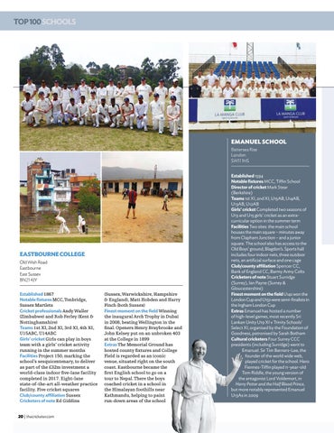 Established 1594 Notable fixtures MCC, Tiffin School Director of cricket Mark Stear (Berkshire) Teams 1st XI, 2nd XI, U15AB, U14AB, U13AB, U12AB Girls’ cricket Completed two seasons of U13 and U15 girls’ cricket as an extracurricular option in the summer term Facilities Two sites: the main school houses the main square – minutes away from Clapham Junction – and a junior square. The school also has access to the Old Boys’ ground, Blagdon’s. Sports hall includes four indoor nets, three outdoor nets, an artificial surface and one cage Club/county affiliation Spencer CC, Bank of England CC, Barmy Army Colts Cricketers of note Stuart Surridge (Surrey), Ian Payne (Surrey & Gloucestershire) Finest moment on the field U14s won the London Cup and U15s were semi-finalists in the Ingham London Cup Extras Emanuel has hosted a number of high-level games, most recently Sri Lankan Unity U19 XI v Trinity Schools’ Select XI, organised by the Foundation of Goodness, patronised by Sarah Botham Cultural cricketers Four Surrey CCC presidents (including Surridge) went to Emanuel. Sir Tim Berners-Lee, the founder of the world wide web, played cricket for the school. Hero Fiennes-Tiffin played 11-year-old Tom Riddle, the young version of the antagonist Lord Voldemort, in Harry Potter and the Half Blood Prince, but more notably represented Emanuel U13As in 2009