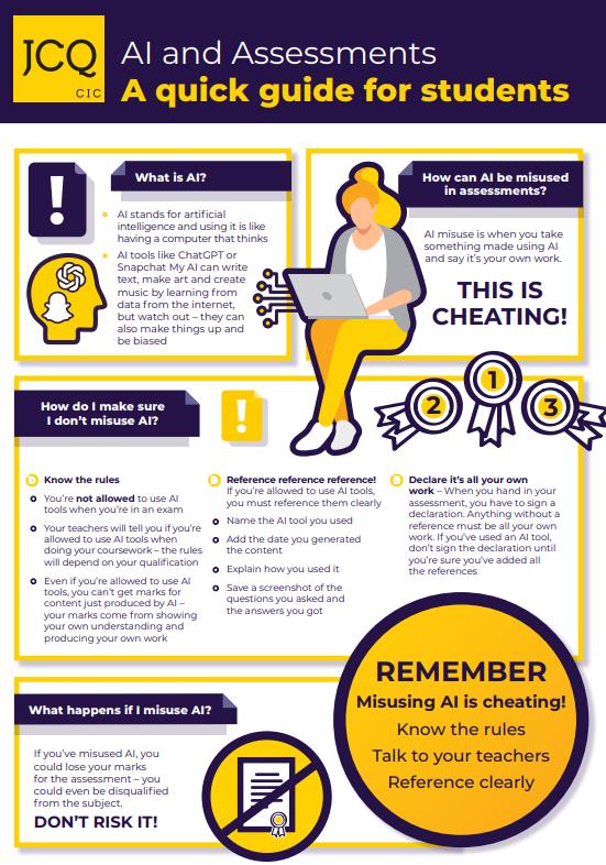 Pay particular attention to the documents relating to non-examination assessments, written exams and social media. The misuse of Artificial Intelligence is cheating so follow the rules and reference clearly in any non-examined assessments. Talk to your subject teacher for further guidance