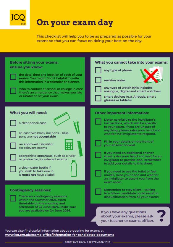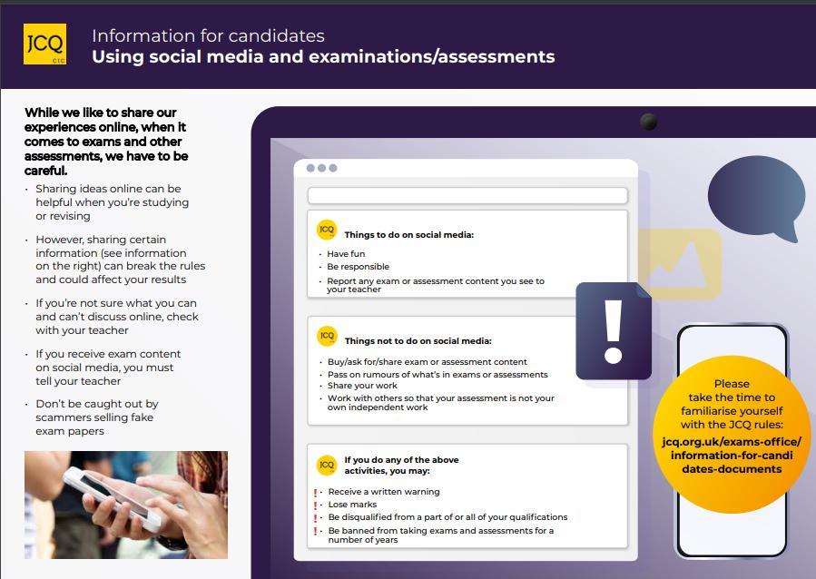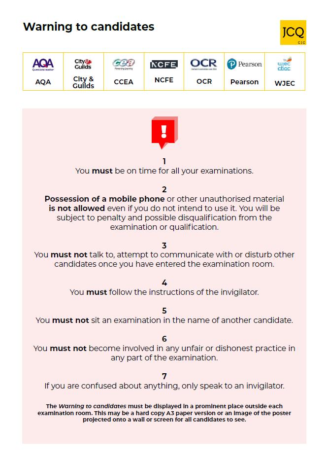 The Joint Council for Qualifications (JCQ) lay out regulations for examinations. You should read and make sure you understand all the JCQ notices. You must read the documents in the link below.