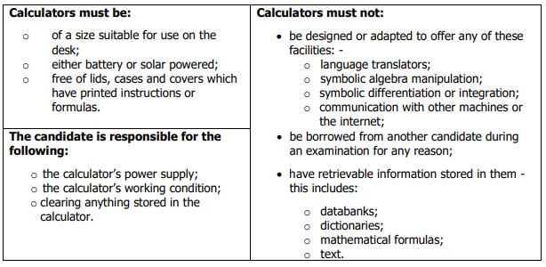 Where the use of a calculator is allowed you are responsible for making sure that your calculator meets the exam boards regulations as below. Should you use a calculator that has an exam mode function you will need to demonstrate it in exams mode and the time lapsed to the invigilators before the exam starts. If you cannot demonstrate this you will not be able to use the calculator