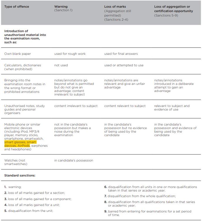 Below are details of sanctions for bringing unauthorised materials into the exam room. For further information and sanctions for other offences see Suspected Malpractice Policies and Procedures 202526 pages 47-52.