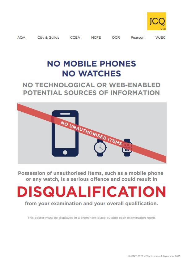 Candidates who break JCQ regulations will be reported to the exam board. The outcome of a breach in regulations may result in disqualification from a paper, subject or exam board. If you do not understand any of the rules please speak with exams office staff who will explain them to you.