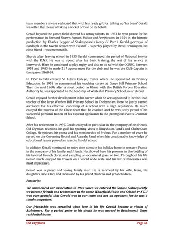 team members always reckoned that with his ready gift for talking up ‘his team’ Gerald was often the means of taking a wicket or two on its behalf. Gerald beyond the games field showed his acting talents. In 1953 he won praise for his performance in Bernard Shaw’s Passion, Poison and Petrifaction. In 1954 in the historic production by Charles Lepper of Shakespeare’s Henry IV Part 1 Gerald portrayal of Bardolph in the tavern scenes with Falstaff – superbly played by David Brazington, his close friend – was memorable. Shortly after leaving school in 1955 Gerald commenced his period of National Service with the R.A.F. He was to spend after his basic training the rest of his service at Innsworth. Here he continued to play rugby and also to do so with the OCRFC. Between 1954 and 1983 he made 217 appearances for the club and he was the Club Captain in the season 1968-69. In 1957 Gerald entered St Luke’s College, Exeter where he specialized in Primary Education. In 1959 he commenced his teaching career at Coney Hill Primary School. Then the mid 1960s after a short period in Ghana with the British Forces Education Authority he was appointed to the headship of Whiteshill Primary School, near Stroud. Gerald enjoyed further development in his career when he was appointed to be the Head teacher of the large Warden Hill Primary School in Cheltenham. Here he justly earned accolades for his effective leadership of a school with a high reputation. He much enjoyed the success of the Chess team that he coached and he was justly proud of his successful personal tuition of his aspirant applicants to the prestigious Pate’s Grammar School. After his retirement in 1995 Gerald enjoyed in particular in the company of his friends, Old Cryptian reunions, his golf, his sporting visits to Kingsholm, Lord’s and Cheltenham College. He enjoyed his chess and his membership of Probus. For a number of years he served on the Governing Board and Appeals Panel when his considerable knowledge of educational issues proved an asset to his old school. In addition Gerald continued to enjoy time spent in his holiday home in western France in the company of his family and friends. He showed here his prowess in the bottling of his beloved French claret and sampling an occasional glass or two. Throughout his life Gerald much enjoyed his travels on a world wide scale and his list of itineraries was most impressive. Gerald was a proud and loving family man. He is survived by his wife, Irene, his daughters Jane, Clare and Fiona and by his grand children and great children. Postscript We commenced our association in 1947 when we entered the School. Subsequently we became friends and teammates in the same Whitefield House and School 1st XV.. I was ever grateful that Gerald was in our team and not an opponent for he was a tough competitor. Our friendship was curtailed when late in his life Gerald became a victim of Alzheimers. For a period prior to his death he was nursed in Brockworth Court residential home. Old Cryptians
