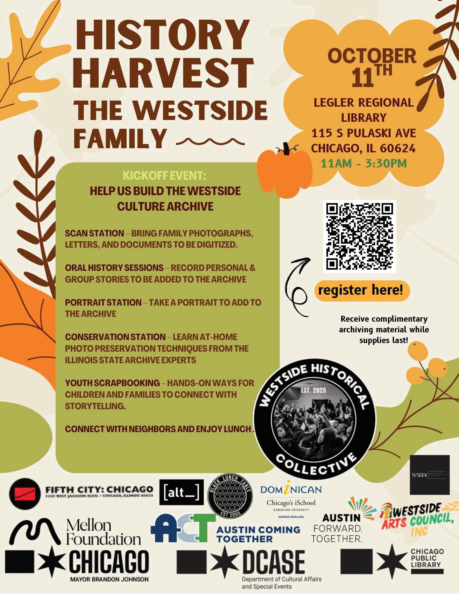 Saturday, Oct. 11, 11 a.m.-3:30 p.m., Legler Regional Library, 115 S. Pulaski Rd. | History Harvest: The Westside Family | Share West Side stories, photos, and keepsakes to help build the Westside Cultural Archive. This free community-centered event is hosted by Kenn Cook Jr., The Culture’s staff photographer, Legler’s Artist-in-Residence, and strategy lead for the Westside Historical Collective. The event marks the kickoff of the Westside Cultural Archive, a digital initiative dedicated to documenting and celebrating the West Side’s rich cultural history. Register at eventbrite.com (Search: History Harvest: The Westside Family).