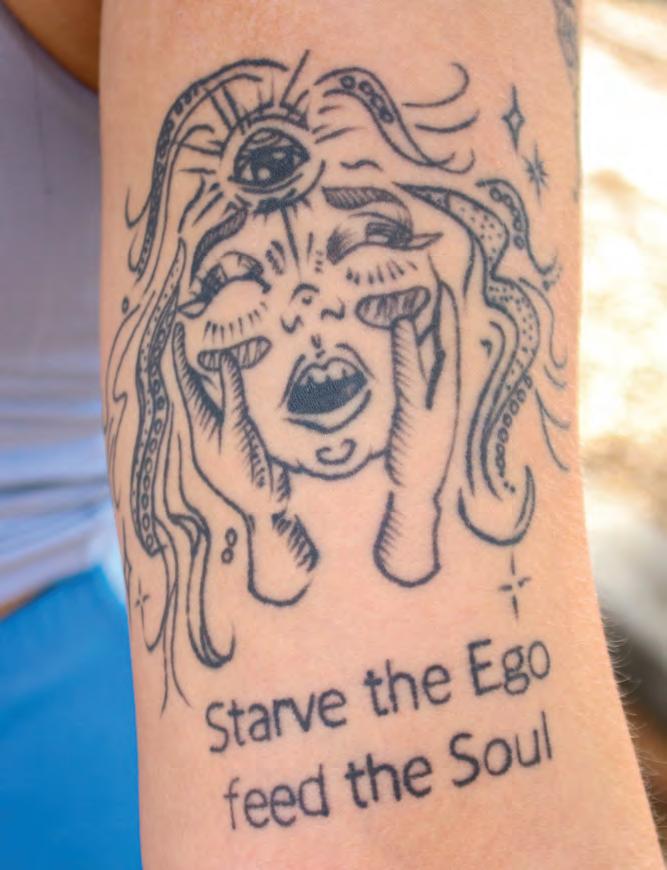 Sandford refers to this tattoo as “my girl.” “I look at this, and I feel it in my bones,” Sandford said. She noted the importance of the script beneath the face, reading “Starve the Ego, feed the Soul.” She said this phrase serves as a reminder to strip herself down and not put more ego into a world that has enough of it.