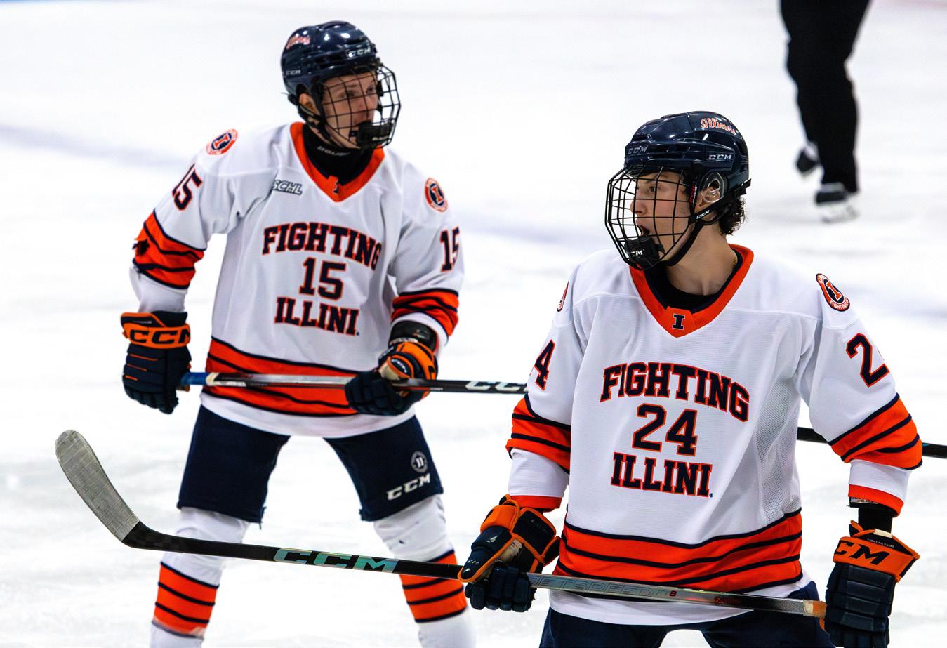 Tyler is a program alum, playing for the team for fve seasons between 2015-16 and 201920. John, who never played for Illinois at the dimensionally unique University of Illinois Ice Arena, appreciates having Tyler around, not only as a brother but also as a mentor.