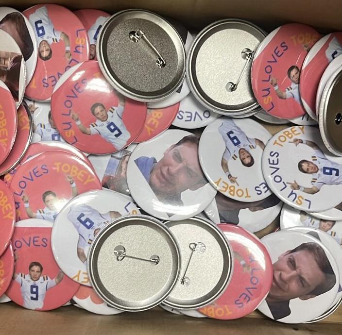 The pins alone have been enough to get students talking. Some designs keep it simple, with images of Maguire from the “Spider-Man” movies. Another design draws on school spirit, with Maguire’s face on former LSU quarterback Joe Burrow’s body and a caption that reads “LSU loves Tobey.”