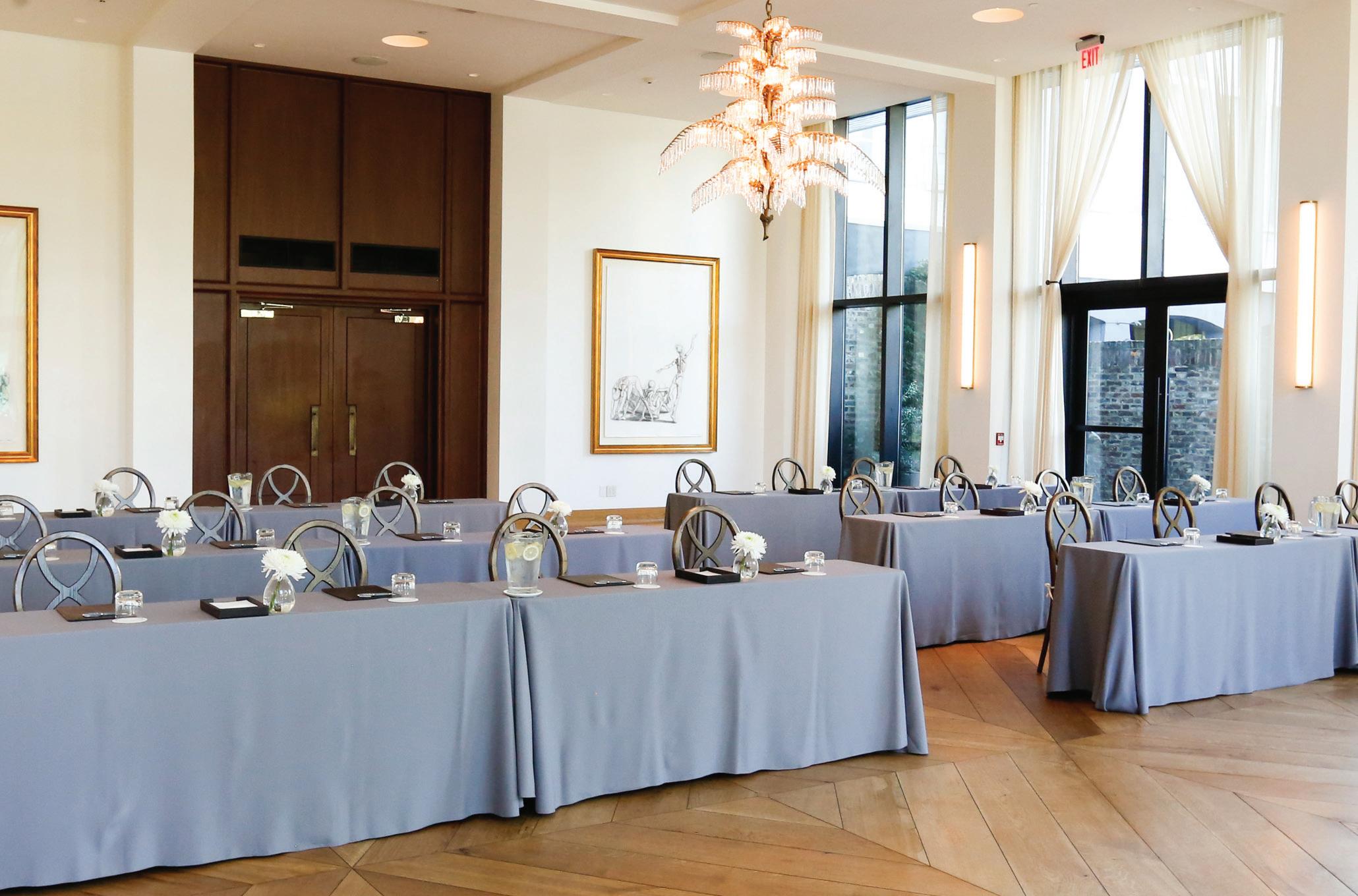 LOCATED ON THE HOTEL’S 8TH FLOOR, the Rivers Room is a one-of-kind space not to be found anywhere else in Charleston. With floor to ceiling windows, the space boasts sweeping views of the Charleston Harbor and Arthur Ravenel Jr. Bridge to the east, and unparalleled views of Marion Square and the steepled skyline of the Holy City to the west. With 15 foot ceilings, this space provides beautiful natural lighting and comes with access to the north deck terrace.