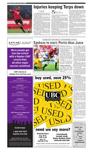 Egekeze to start; Portis likes Juice NOTEBOOK, from Page 10 practices this week. We’ll play the guy I feel can best help us win the football game.” Steffy and Turner were not available for comment. But Friedgen did promise that Steffy will make an impact again this season, saying his senior starter, who started the first five games last season before sustaining a concussion, will come in and win a game for the Terps at some point. “I’m like the father, and if you boo my son, I’m going to get upset,” Friedgen said. “That’s how I look at this kid.”