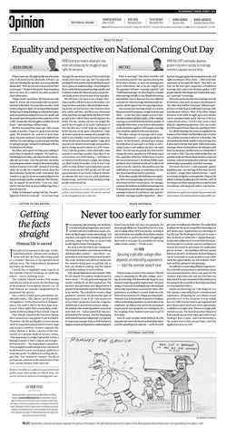 Equality and perspective on National Coming Out Day JOSHUA DOWLING When I came out, I thought my life was effectively over. It all started in the aftermath of Prop 8. An hour into debating the question, my mom pointedly demanded, “Why do you care so much about this? Are you gay?” I broke at that point. Tears streaming down my face, all I could do was utter an almost silent affirmation. Things weren’t good then. My friends were iffy about it, at best. My relationship with my parents teetered on the brink. For more than a month, I went to bed crying every night. It’s an impossibly hopeless feeling to go to sleep thinking your friends have gone and your parents no longer love you. For myself, and thousands upon thousands of other members of the LGBT community, that struggle is a reality we’ve all faced — and sometimes still face today. But that was nearly four years ago. After a tense couple of months, I began to speak to my mother again. We worked it out, and we’ve never been closer. My mom’s primary concern has shifted from whether I’m committing a moral wrong to whether I’m going to get gay-bashed if I hold hands with my boyfriend on the Metro. My father and I spent two long years talking to each other in simplistic snippets. We barely acknowledged each other, and when we did, it invariably left me in tears. Over the past year, my father has undergone a drastic change in his understanding of what it means to be LGBT. Instead of worrying about my sex life, he’s started to worry about the discrimination facing the LGBT community. Just a week or so ago, he wrote an email noting how he hoped marriage equality would pass this November. He signed the email with, “Love you, Dad,” and for the first time in an incredibly long time, I knew it was true. Today, on National Coming Out Day, I’m privileged not to have to come out — to not have to go