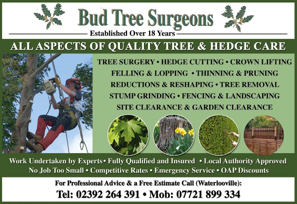 To advertise your business call 01730 260746 or email sales@thedirectorygroup.co.uk DRIVEWAY & LANDSCAPE SOLUTIONS info@bwdriveways.co.uk www.bwdriveways.co.uk Tel: 02392 000293 or 01243 213 135 Beewise & call for more info… Free Quotes BEEWISE DRIVEWAYS Block Paving Tarmac Resin Bound Garden Clearance Tree Removal Drainage/Soakaways Brickwork Garden Walls DRIVEWAYS • PATIOS • PATHWAYS Trading Standards Approved Contractors Tree Care Tree Surgery Tree Felling ARBRO Tree Surgeons Ltd 10 million Public/Employers Insurance For a FREE Estimate contact Richard Wilson on: 02392 571766 Email: richardwilson_arbro@yahoo.co.uk Richard Wilson Cert Arb RFS Over 35 years experience with Academic and Practical Qualifications in: Stump Removal Hedge Trimming And Much More If you have a low household income or are in receipt of specified benefits, we can help by capping your water bill at £82.73 for the year 2022/2023. Spread the cost of payments... We can offer a range of affordable flexible payment plans. We can help customers who are struggling financially with a payment break and offer a payment matching scheme for customers who owe over £300. Helping Hand Social Tariff Difficulty paying your water bill? Portsmouth Water Portsmouth Water ARE HERE TO HELP... portsmouthwater.co.uk 023 9249 9666