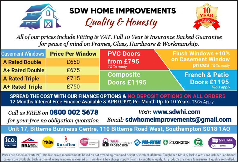 Taking Local Businesses into 92,300 homes, every month of the year! 02392 983590 or online gutterpro.co.uk Get an instant price Insurance work undertaken FREE estimates & advice 07867 746721 lkbowringplastering@yahoo.co.uk Over 25 years experience LEE BOWRING PLASTERING Plastering Float & Set Skimming Storm & Flood Damage Sound Proofing Floor Screeding Decorating Rendering Coving Damp Proofing Condensation Control For enquiries or a FREE quote call: 02392 383871 or 07909 094791 chris@draytonhomeimprovements.co.uk www.draytonhomeimprovements.co.uk Windows Doors Conservatories Handles Hinges & Locks Composite Doors French & Patio Doors Bi-folding Doors Glass Roof Lanterns Glass Replacement Fogged & Misted Units Services Include: Insurance backed guarantee For all your uPVC Windows, Doors & Conservatories Drayton Home mprovements With over 30 years of experience, we can fit or supply high quality windows, doors and conservatories to meet your needs.