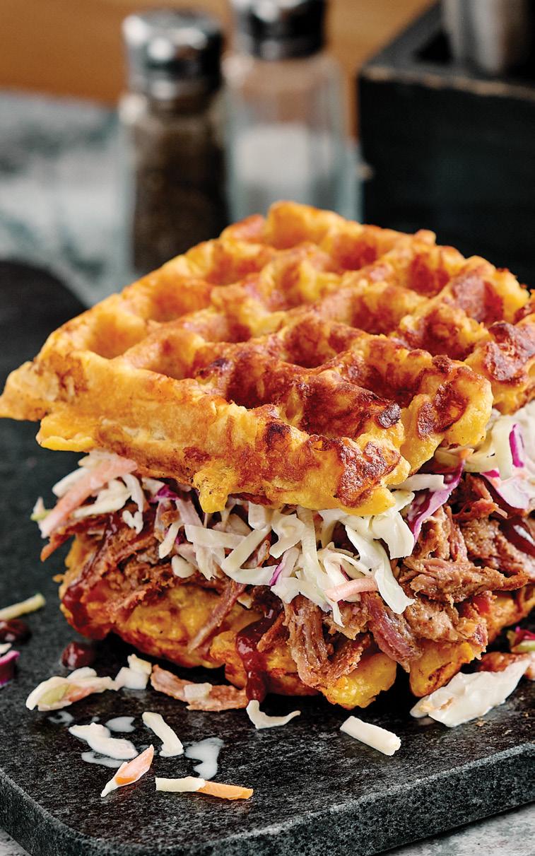 If you’re a bar & grill waffling about menu additions, let this tangy stack of handheld BBQ crunch make the decision easy. Pack Ridgecrest® Pulled Pork, roasted red pepper Peak® Coleslaw Mix, and Delancey Street® Mac & Cheese in between slabs of goldenbrown waffles.