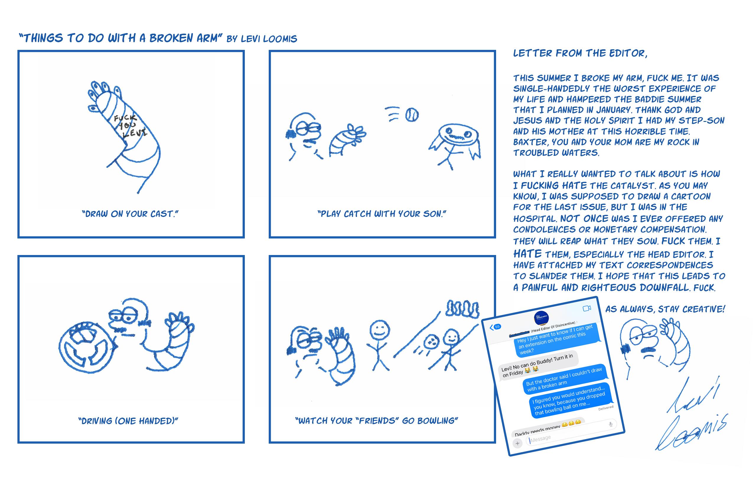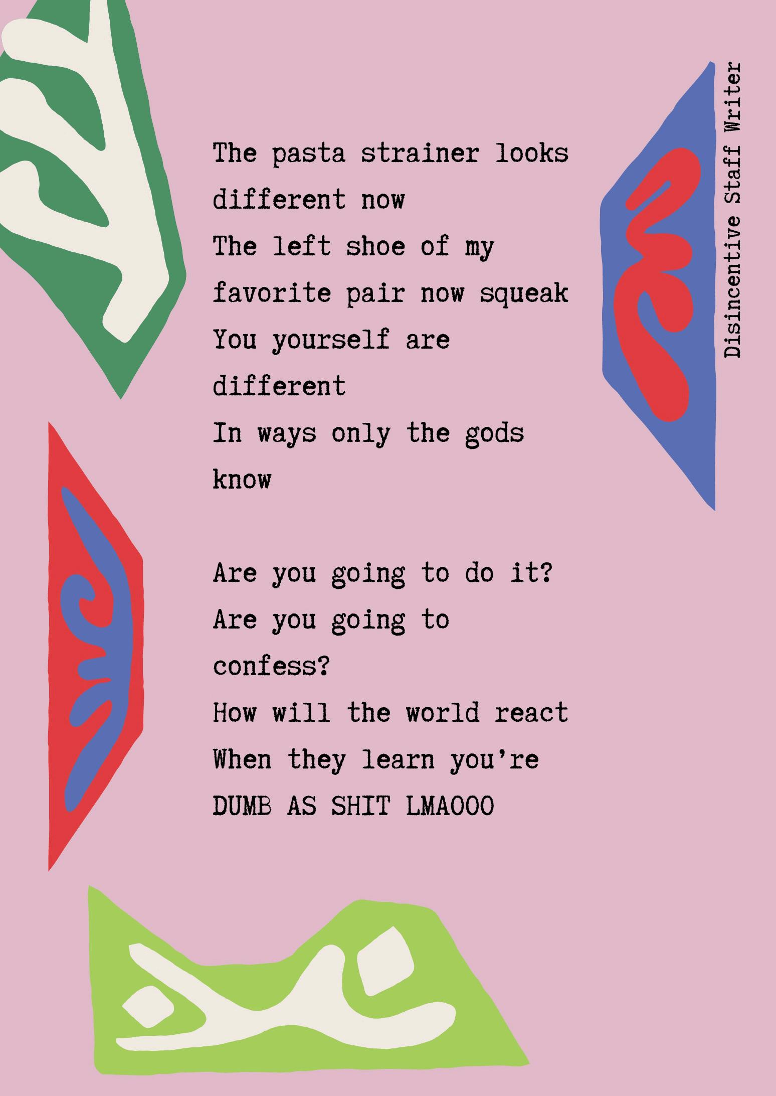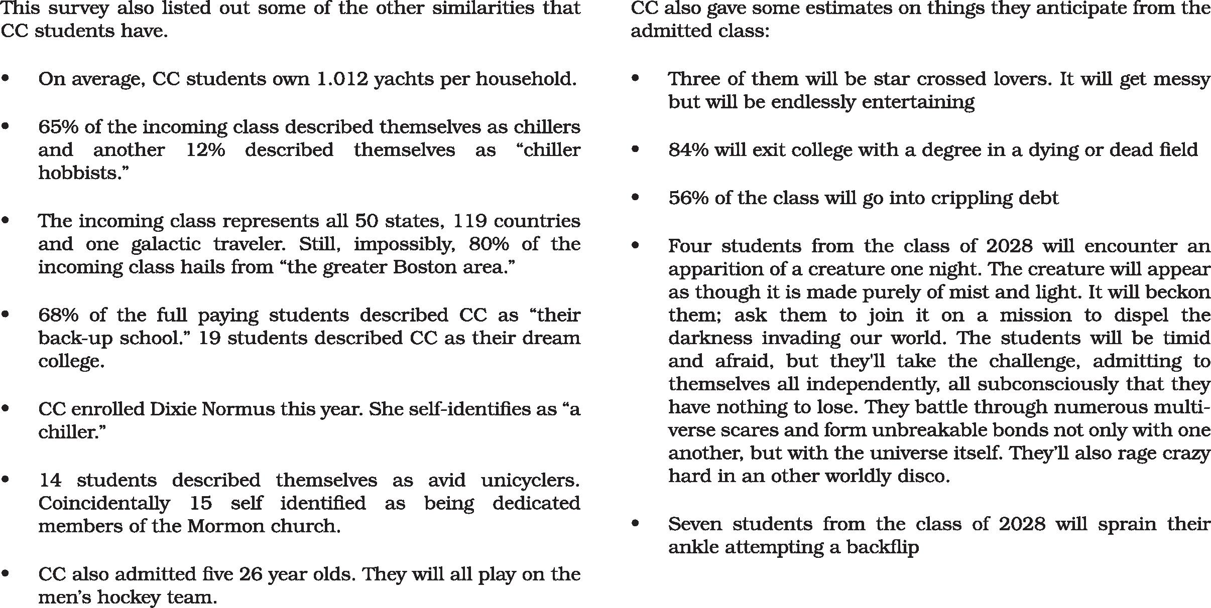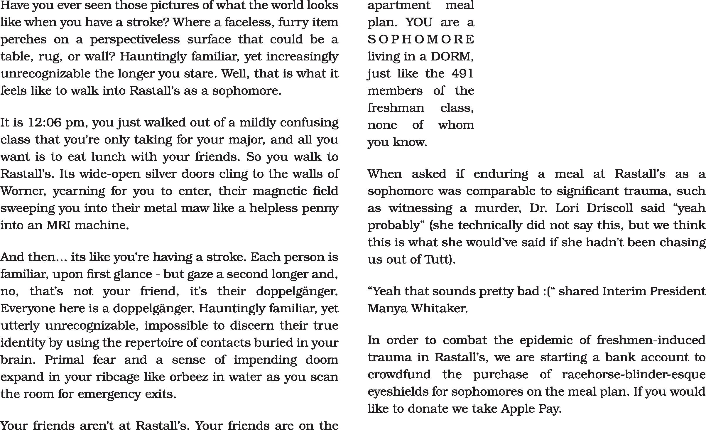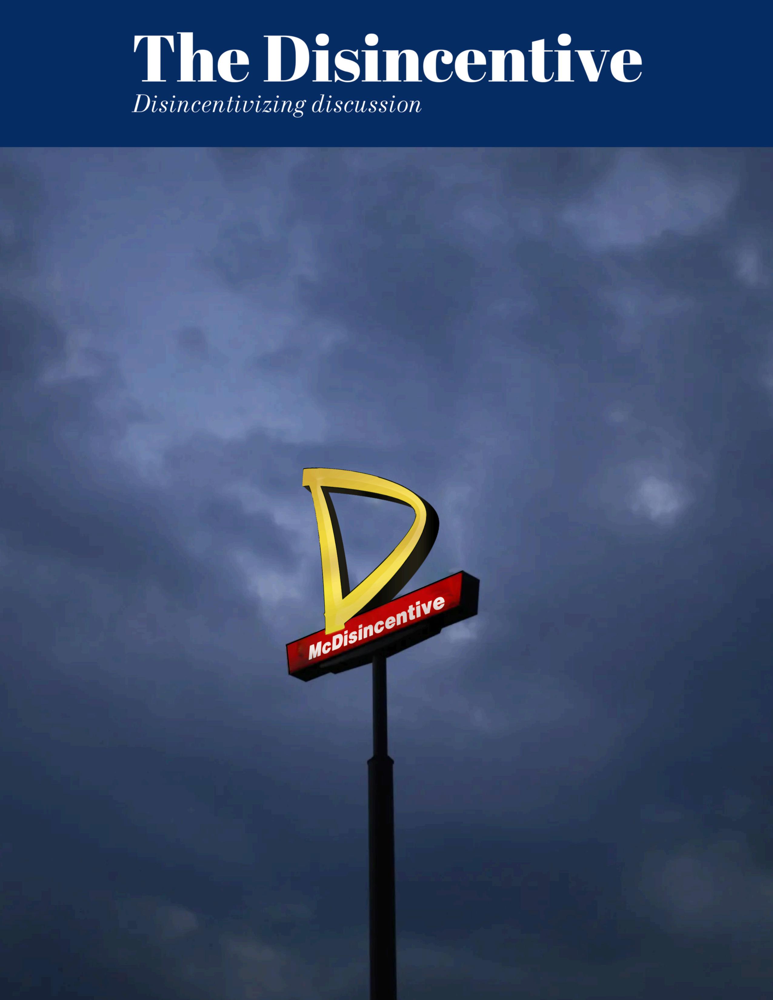 Everything in this paper is completely satirical. While we took inspiration from our campus and the surrounding community, we made up everything here. The quotes, the events, the news: all of it is NOT REAL. Any similarity to any person, living or dead, is purely coincidental. We have deep respect for the efforts and products of on-campus publications and are privileged to draw inspiration from their work. Thank you for picking up a copy of The Disincentive. We look forward to never talking.