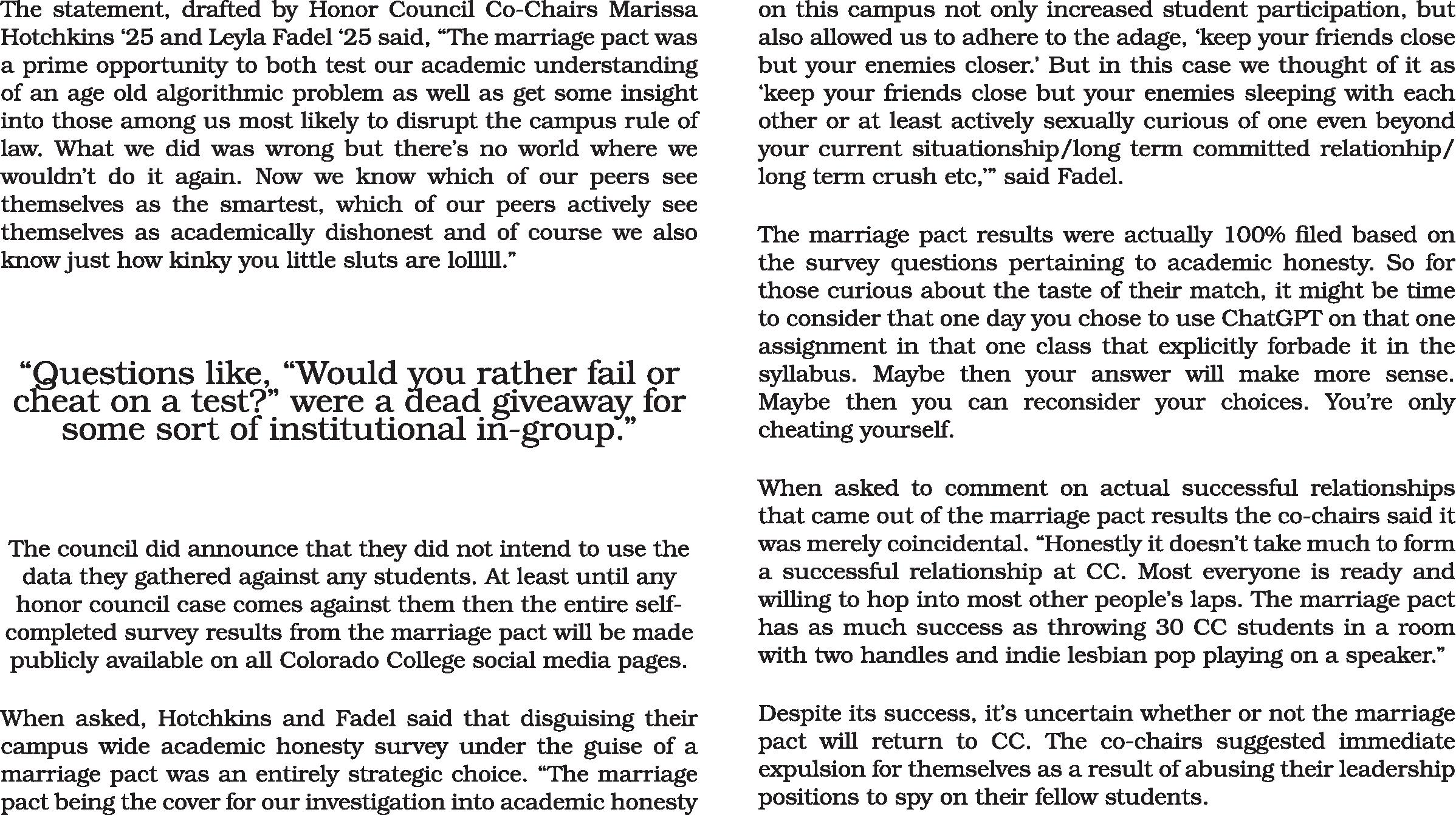 It was only with the genius of the investigative minds at The Disincentive that we are able to finally shed light onto the mysterious organizers of this endlessly popular pact. At Colorado College the marriage pact was organized by none other than the Colorado College Honor Council.