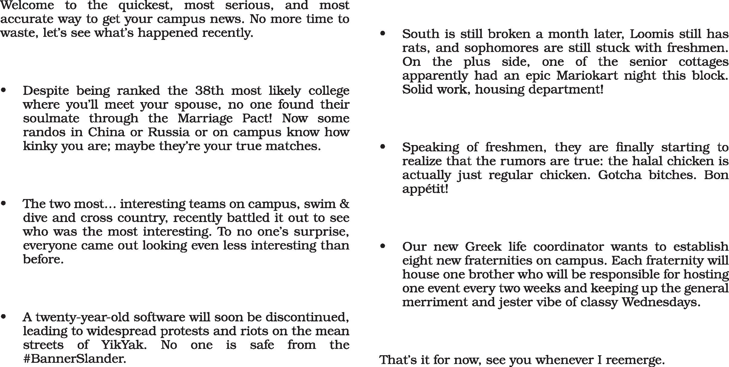 Good to be back in your hands again. Your strong, capable hands. (Mmmm.) We heard from the people who heard from folks on campus that some have been calling us an “organizational mess” and “a sorry excuse for satire” and “a waste of Culter Publication’s money.”
