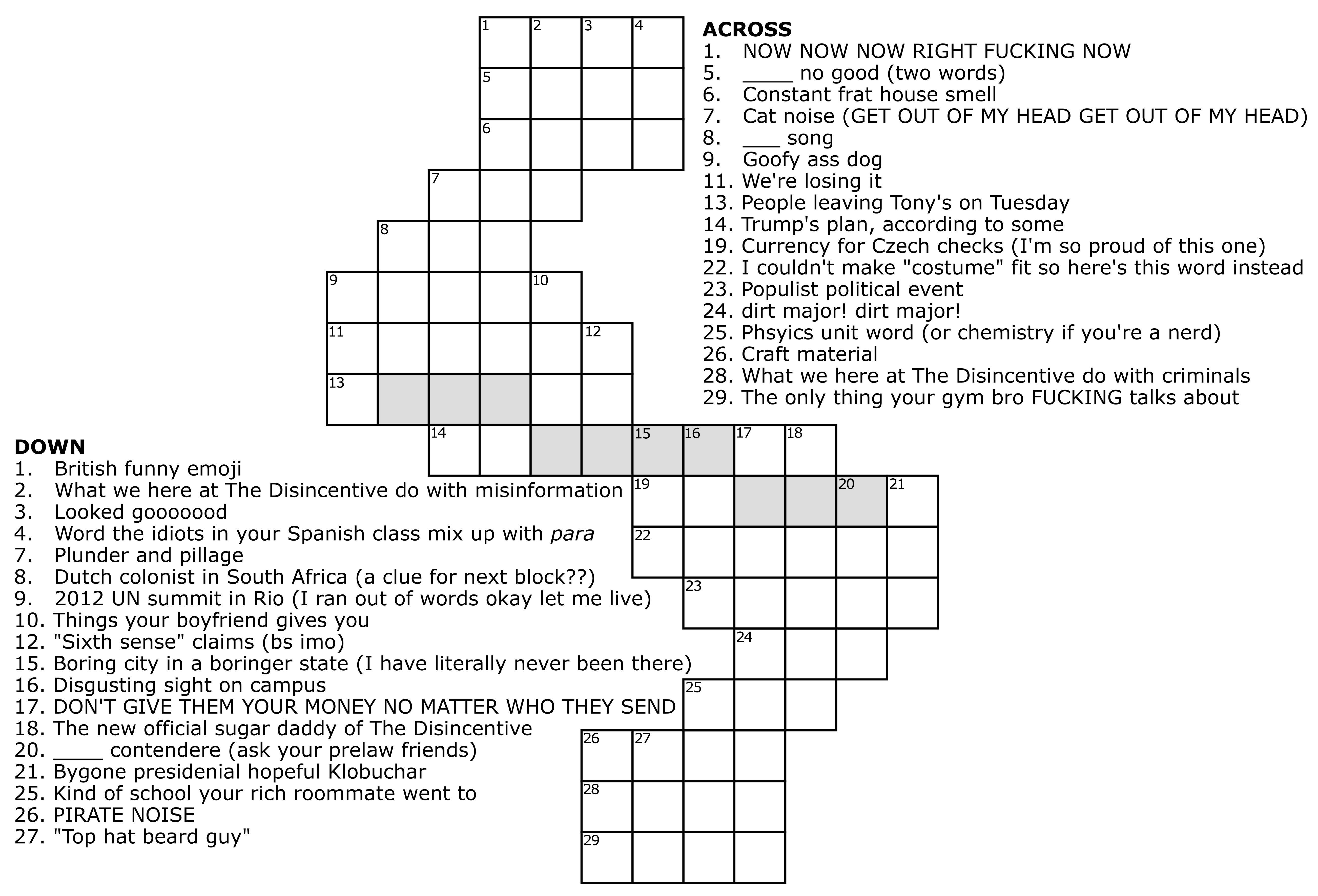 If you read the Catalyst (which we all know you don’t), you may have noticed a little post-debate op ed about Harris’ supposedly “nothing” platform. Well, our humble crossword editor disrespectfully disagrees. In fact, they’ve hidden three fundamental tenets of Harris’ plan in the gray squares in this block’s puzzle.