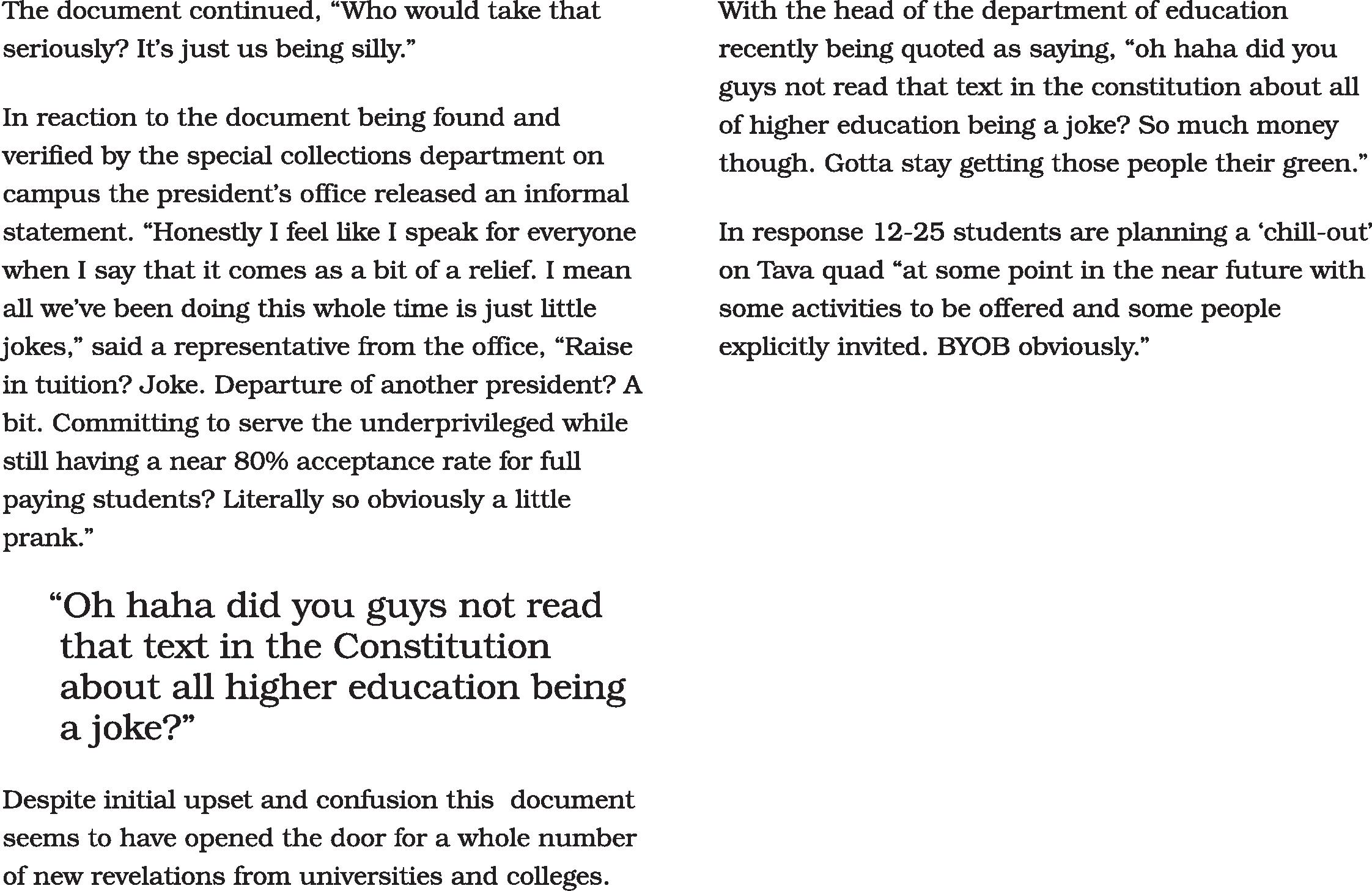 Late Monday afternoon news broke of priceless founding documents pertaining to the origins of Colorado College being uncovered in Palmer basement. The documents were found after a minor explosion resulting from faulty experiment equipment in a principles of macroeconomics class.